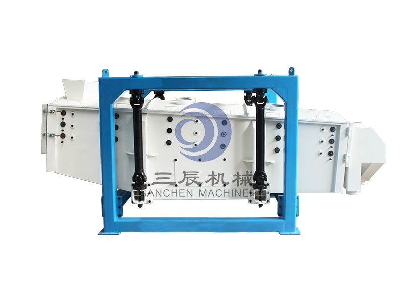 篩機(jī)啟動(dòng)后,篩機(jī)搖動(dòng)體即篩箱在慣性力的作用下作前后往復(fù)運(yùn)動(dòng),篩箱帶動(dòng)篩面作周期性搖動(dòng),從而使篩面上的物料隨篩箱一同作定向跳式運(yùn)動(dòng),期間,小于篩面孔徑的物理通過(guò)篩孔落到下層,成為篩下物,大于篩面孔徑的物料經(jīng)連續(xù)翻滾跳運(yùn)動(dòng)后從排料口排出,完成篩分工作。
